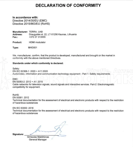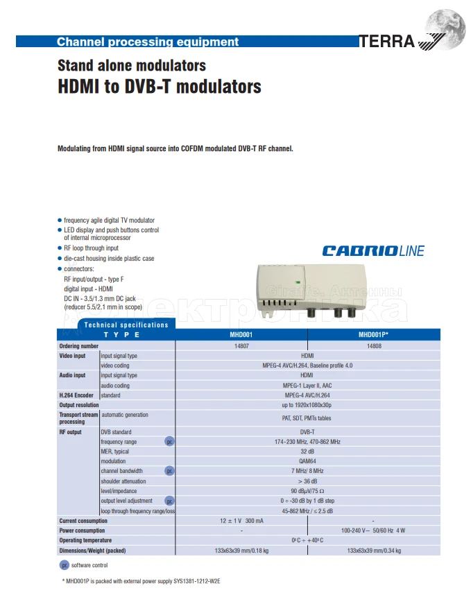 Цифровой Модулятор HDMI - DVB-T Terra MHD001P преобразует HDMI видео и аудио сигналы в DVB-T сигнал в метровом и в дециметровом диапазонах. Используется профессионалами в кабельных сетех и любителями для формирования тв-канала на любой частоте МВ и ДМВ диапазонов из любого источника HDMI - сигнала : цифровая или Смарт-приставка, Спутниковая приставка (Триколор, НТВ Плюс, МТС, Телекарта и др.), Видеорегистратор видеонаблюдения, Видеопроектор и т.д. Также может использоваться в котеджах для создания собственной мультимедийной сети. Качество принятого телевизором преобразованного сигнала - такое же, как и у источника, т.е. без потерь.