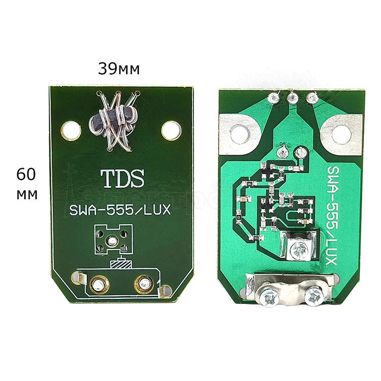 Усилитель SWA-555 представляет собой двухкаскадный апериодический усилитель ВЧ на биполярных микротранзисторах Т67 (BFG-67) или BFR-91A. Первый каскад — широкополосный, без коррекции. Во втором каскаде имеется коррекция: конденсатор С5 в цепи токовой ООС транзистора VT2 обеспечивает спад АЧХ на нижних частотах рабочего диапазона, а конденсатор С4 в цепи ООС по напряжению ограничивает усиление на верхних частотах и за пределами рабочей полосы. АЧХ усилителя показана на рис. 2. В целом схемы усилителей SWA-555 и SWA-9 практически полностью совпадают (у первого лишь отсутствует LC-фильтр в цепи питания и изменены некоторые номиналы пассивных элементов). Поэтому и АЧХ усилителей близки. Однако при использовании в первом каскаде малошумящего транзистора BFR-91A (Кш =1,6 дБ) усилитель SWA-555 имеет меньший коэффициент шума.