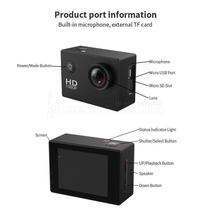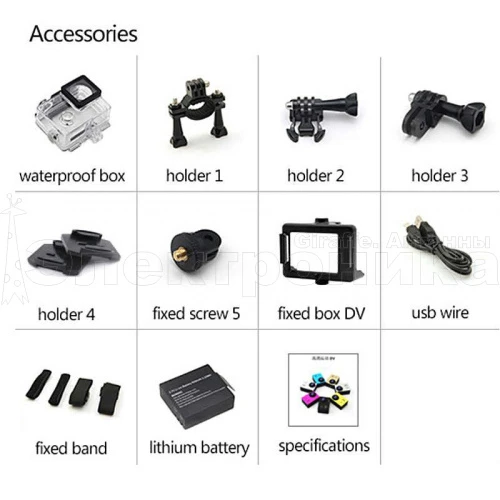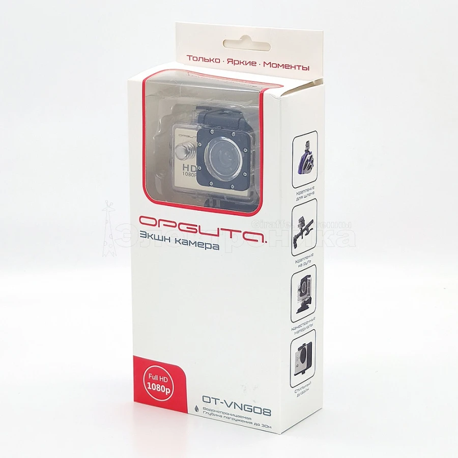 Комплектация: водонепроницаемый чехол, крепления для шлема/велосипеда, кабель ЗУ, блок питания, инструкция на Русском